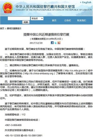 中新网12月21日电 据中国驻黎巴嫩大使馆网站消息,鉴于近期局势发展,黎巴嫩安全形势趋于复杂。中国驻黎巴嫩使馆特别提醒: