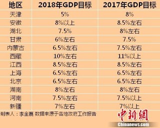 有的省份下调增长目标,也有省份设定的GDP目标与去年保持一致。其中,北京、上海、江西、湖南等地提出的2018年GDP增长目标,与2017年持平。
