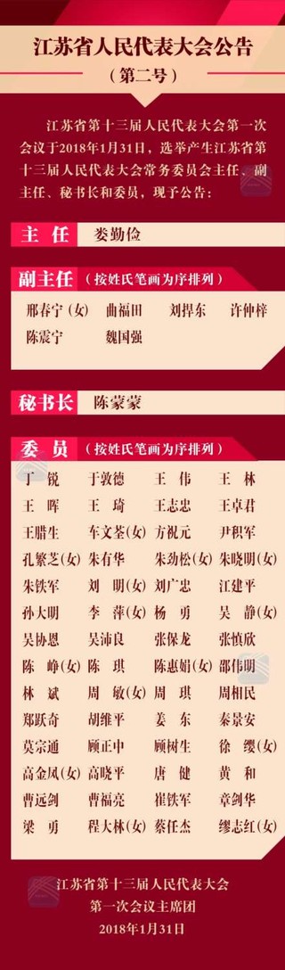 娄勤俭当选江苏省人大常委员会主任,陈震宁、许仲梓、邢春宁、刘捍东、魏国强、曲福田当选副主任,陈蒙蒙当选秘书长,56 人当选省人大常委会委员。