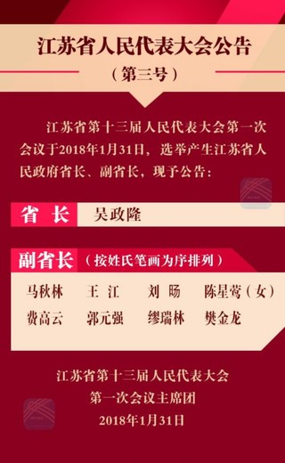 吴政隆当选江苏省人民政府省长,樊金龙、缪瑞林、马秋林、王江、郭元强、费高云、刘旸、陈星莺当选副省长。