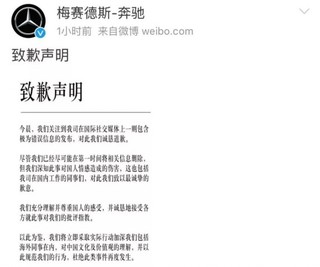 5日,有网民发现奔驰在instagram官方账号上发布了一张宣传海报,宣传语直接引用达赖喇嘛的言论,大意为“从不同角度看待自己的境遇,你将拥有更开放的视野”。该广告引发中国网民不满,奔驰公司6日在微博账号上致歉,称第一时间将相关信息删除,并因此事对中国人情感上造成的伤害,向中国人民致以最诚挚的歉意。奔驰道歉后,仍有不少中国网民表示不认同。有人说,先表明自己的政治主张再道歉,反正政治影响已“到位”,钱还一样赚。