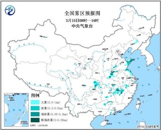 中央气象台同时发布了大雾黄色预警。预计,3月15日早晨至上午,河南中部、山东东部、江苏东北部、湖北中部、湖南中部和南部、江西北部、四川盆地东部等地的部分地区有大雾,其中河南中部和南部、山东东部、江西北部、四川盆地东部等地的部分地区有能见度不足200米的强浓雾,局地有能见度不足50米的特强浓雾。
