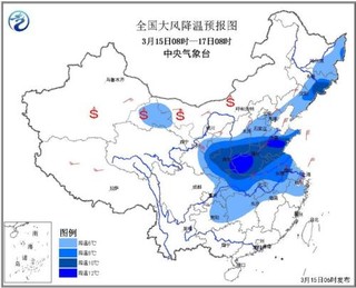 中新网3月15日电 中央气象台15日06时继续发布寒潮蓝色预警和大雾黄色预警:预计15日白天至16日,西北地区东南部、东北地区东部、华北南部、黄淮、江淮、江汉、江南北部等地气温将下降6~10℃,部分地区降温幅度可达12℃以上;3月15日早晨至上午,河南中部、山东东部、江苏东北部、湖北中部、湖南中部和南部、江西北部、四川盆地东部等地的部分地区有大雾。