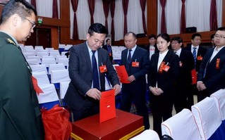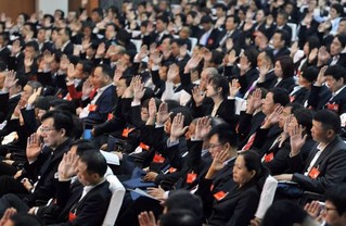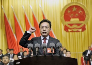 根据大会主席团《运城市第四届人民代表大会第四次会议组织宪法宣誓安排意见》,全场起立,奏唱国歌后,新当选的运城市人民政府市长朱鹏进行宪法宣誓。