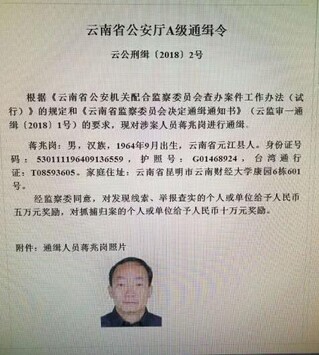 通缉令显示,根据《云南省公安机关配合监察委员会查办案件工作办法(试行)》的规定和《云南省监察委员会决定通缉通知书》的要求,现对涉案人员蒋兆岗进行通缉。