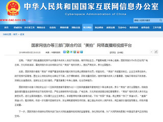 中国网信网消息,近期,“美拍”网络直播短视频平台传播涉未成年人低俗不良信息,破坏网络生态,严重影响青少年身心健康。国家网信办于6月1日会同广电总局、文化和旅游部、属地网信办依法依规联合约谈“美拍”相关负责人,提出严肃批评,责令全面整改。