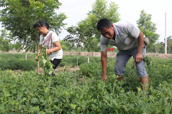 天气炎热,位于颍泉区闻集镇的大丰收农业种植合作社的薄壳山核桃种植基地里,却是一片繁忙的景象。人们正在为果树施肥、除草、灌溉,他们都是来自周边镇村的贫困户,刚刚加入合作社不久。