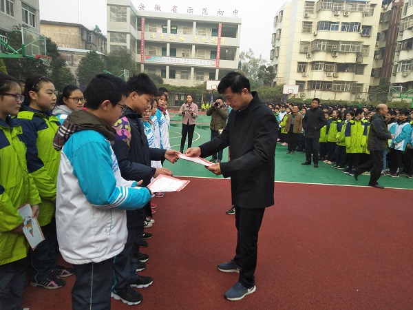 在升旗仪式结束后,副校长孙洁玉宣读了本届书画摄影大赛学生获奖名单。校长李宜强、副校长吴明等领导分别为获奖学生颁发了荣誉证书和奖品。