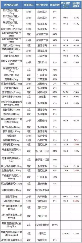 此外,阿托伐他汀钙片、瑞舒伐他汀钙片、利培酮片、吉非替尼片、厄贝沙坦氢氯噻嗪片、替诺福韦片等药品降幅超过70%。