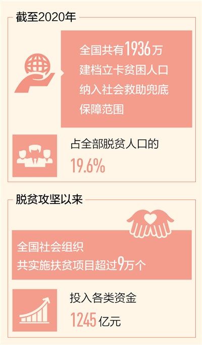 民政部门引导社会组织、慈善力量、专业社工、志愿者参与脱贫攻坚,使兜底保障既有力度,更有温度。脱贫攻坚以来,全国社会组织共实施扶贫项目超过9万个,投入各类资金1245亿元,为决战决胜脱贫攻坚作出了重要贡献。