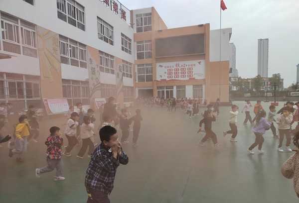 警报声突然拉响,泉北小学各班学生在老师的组织带领下,在各关键点疏散负责人的引导下,捂住口鼻,弯着腰,按预定的疏散线路进行模拟撤离。学生迅速跑下楼梯,有秩序地集结在操场指定位置,快速的反应展示了泉北小学师生的应急处理能力和正确的逃生应对方法。