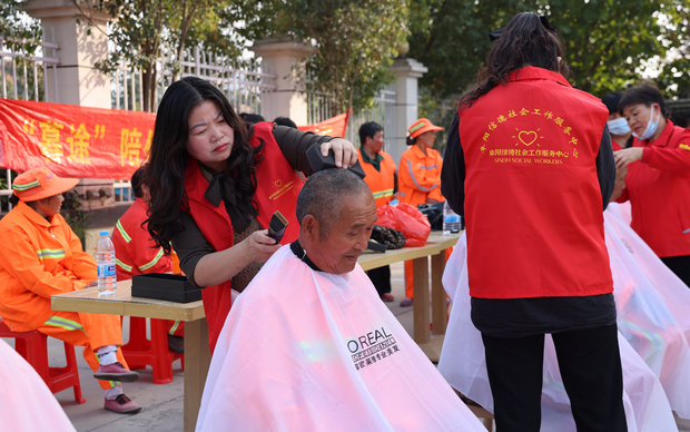 10月26日,环卫工人节当天,阜阳市颍泉区总工会、区城管执法局在生态园工会户外劳动者爱心驿站开展“送宣讲、送健康、送法律、送关爱、送知识、送咨询、送慰问”等“七送”系列服务活动,致敬“城市美容师”,让环卫工人成为“座上宾”。